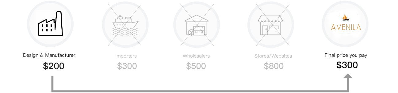 Traditional stores have their priced marked up several times as it has to go from the design & manufacturer, to the importer to the wholesaler to the store then to the final consumer. Avenila has direct relationships with global factories in warehouses where we ship items direct to you.